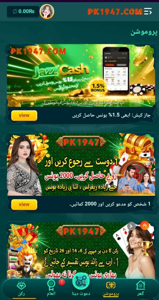 One of the strongest features of PK 1947 Game is its support for commonly used payment methods in Pakistan. Users can deposit and withdraw funds using familiar options, making the platform more accessible and trustworthy for local players.